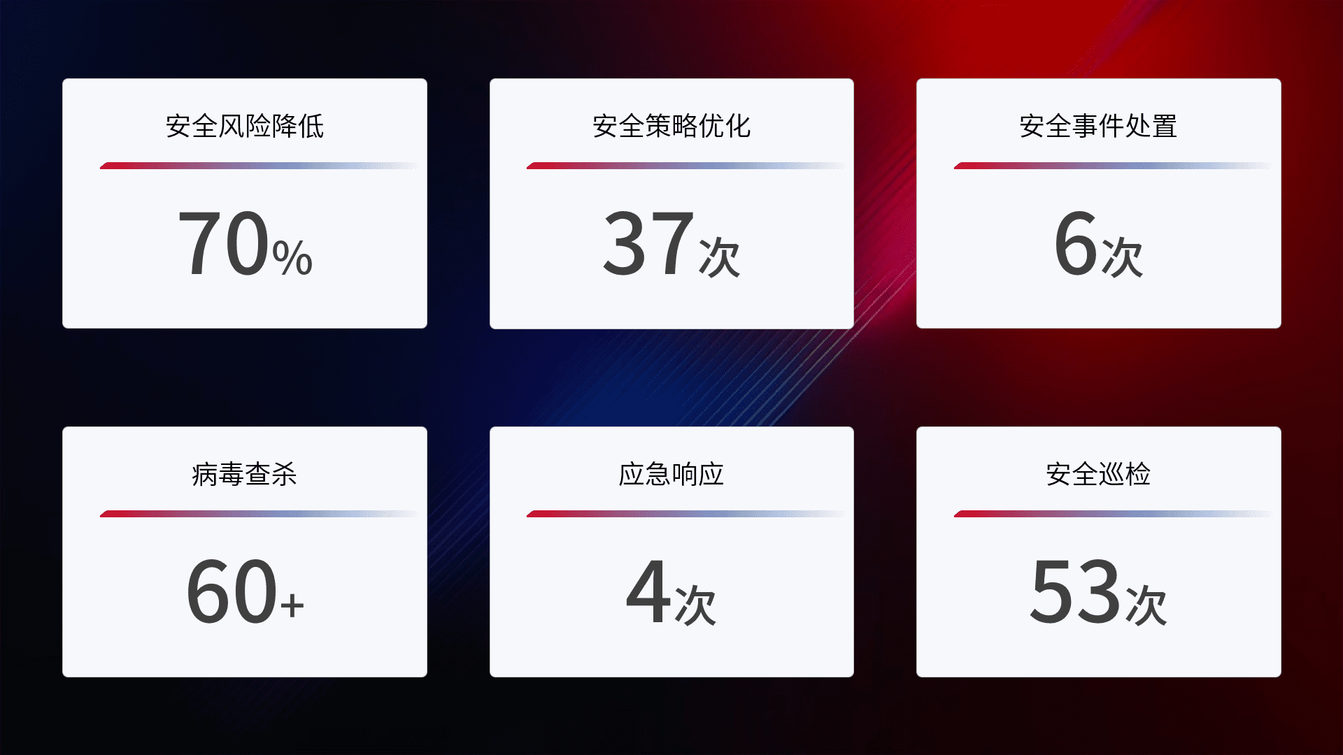 提供全面的安全事件报告体系,,,,包括处置报告、、、周报、、季度和年度总结,,,,结合持续监控,,,帮助客户深入了解网络安全状况。。。